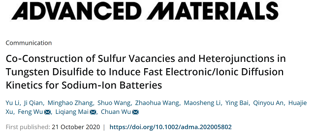 近日,北京理工大学材料学院吴锋院士团队在钠离子电池材料的结构设计和性能优化方面取得重要突破。材料类国际顶级期刊《Advanced Materials》(《先进材料》,影响因子27.398)以“Co-Construction of Sulfur Vacancies and Heterojunctions in Tungsten Disulfide to Induce Fast Electronic/Ionic Diffusion Kinetics for Sodium-Ion Batteries”为题在线报道了这一研究进展。该工作由吴锋院士团队的吴川教授课题组完成,北京理工大学材料学院博士后李雨为第一作者,北京理工大学吴锋院士、吴川教授和武汉理工大学麦立强教授为共同通讯作者(文献链接:https://onlinelibrary.wiley.com/doi/10.1002/adma.202005802)。
