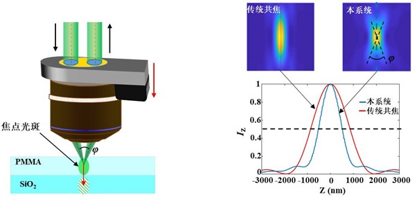(a) 斜向激发与收集光路 (b) 压缩了散射体轴向尺寸