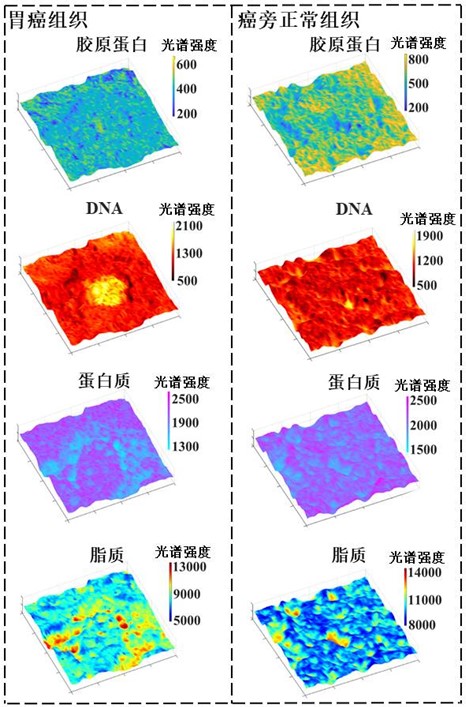 图5给出了DLDCRB光谱显微镜对胃癌组织与癌旁正常组织的化学成像结果,浓度由拉曼光谱特征峰的强度来表征。胃癌组织与癌旁正常组织化学成像结果相比:胶原蛋白浓度低且分布离散;胃癌细胞的DNA物质浓度高且分布范围大;胃癌组织细胞基质内的蛋白质浓度低;胃癌组织的脂质在基质内浓度高,而正常组织的脂质分布相对均匀。