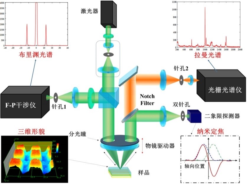 鉴于此,该团队在国家自然基金重点项目“机械形态性能激光分光瞳差动共焦布里渊—拉曼光谱测量原理与传感系统(51535002)”等项目支持下,发明了图1所示的高稳定、高分辨、抗散射分光瞳激光差动共焦拉曼-布里渊(Divided-aperture Laser Differential Confocal Raman-Brillouin,DLDCRB)图谱成像新方法(授权中国发明专利ZL 201410086366.5和欧洲发明专利EP 3118608 B1),该方法将分光瞳激光差动共焦显微技术与拉曼光谱和布里渊光谱探测技术相结合,通过差动共焦测量技术进行纳米精度的样品定焦,来提高系统空间分辨力和稳定性;通过分光瞳斜向激发与探测技术进行反射光和层间散射光等干扰光的抑制,来提高系统的光谱探测信噪比;通过拉曼光谱与布里渊光谱的同源激光激发与高分辨分离探测,来实现微区几何形貌、拉曼光谱和布里渊光谱的高稳定、高分辨原位图谱成像。