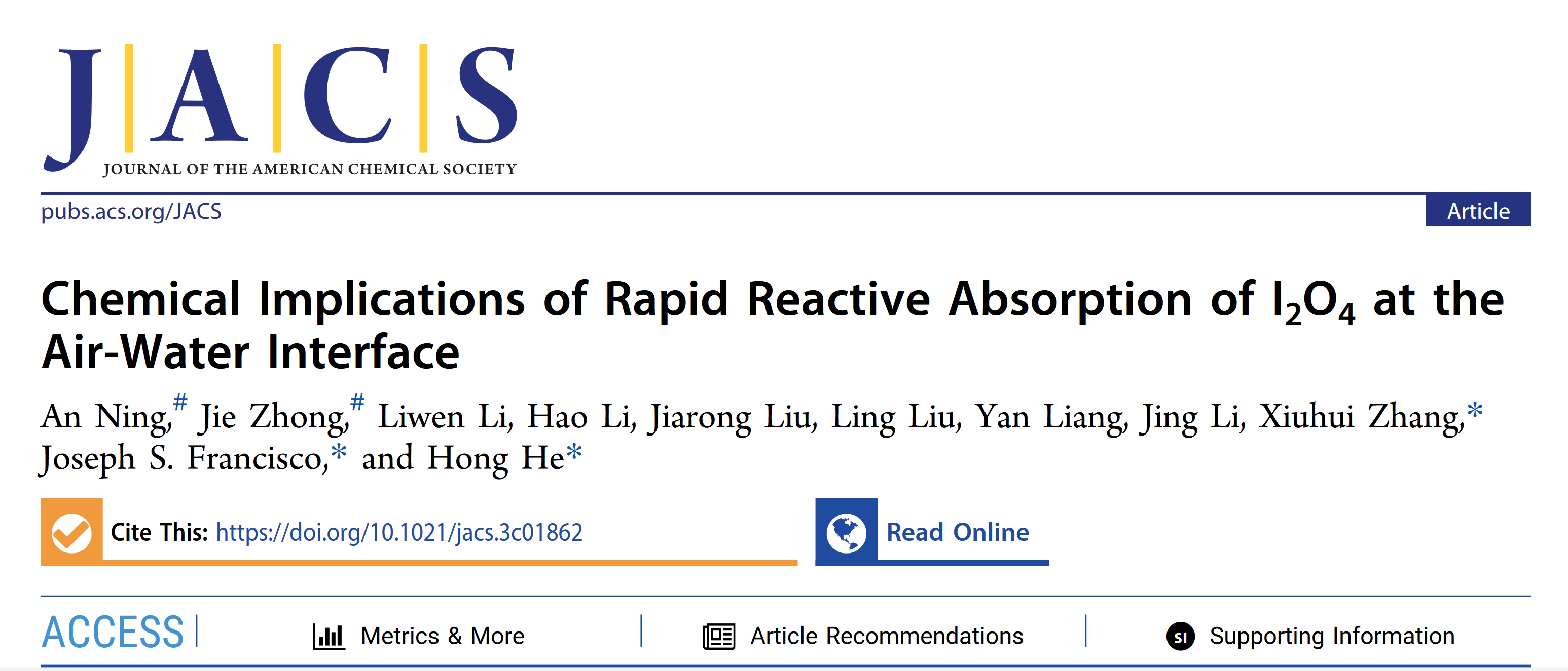 近日,北京理工大学化学与化工学院/原子分子簇科学教育部重点实验室张秀辉教授团队与中科院生态环境中心贺泓研究员团队和美国宾夕法尼亚大学Joseph S. Francisco教授团队合作,在海洋气溶胶增长机制研究方面取得重要进展。相关研究成果以“Chemical Implications of Rapid Reactive Absorption of I2O4 at the Air-Water Interface”为题,在国际顶级化学期刊《美国化学会志》( Journal of the American Chemical Society , JACS )上发表(DOI: 10.1021/jacs.3c01862)。该工作以北京理工大学为第一通讯单位,张秀辉教授、贺泓研究员和Joseph S. Francisco教授为共同通讯作者,北京理工大学化学与化工学院博士后宁安与中国石油大学钟杰教授为该论文的共同第一作者。
