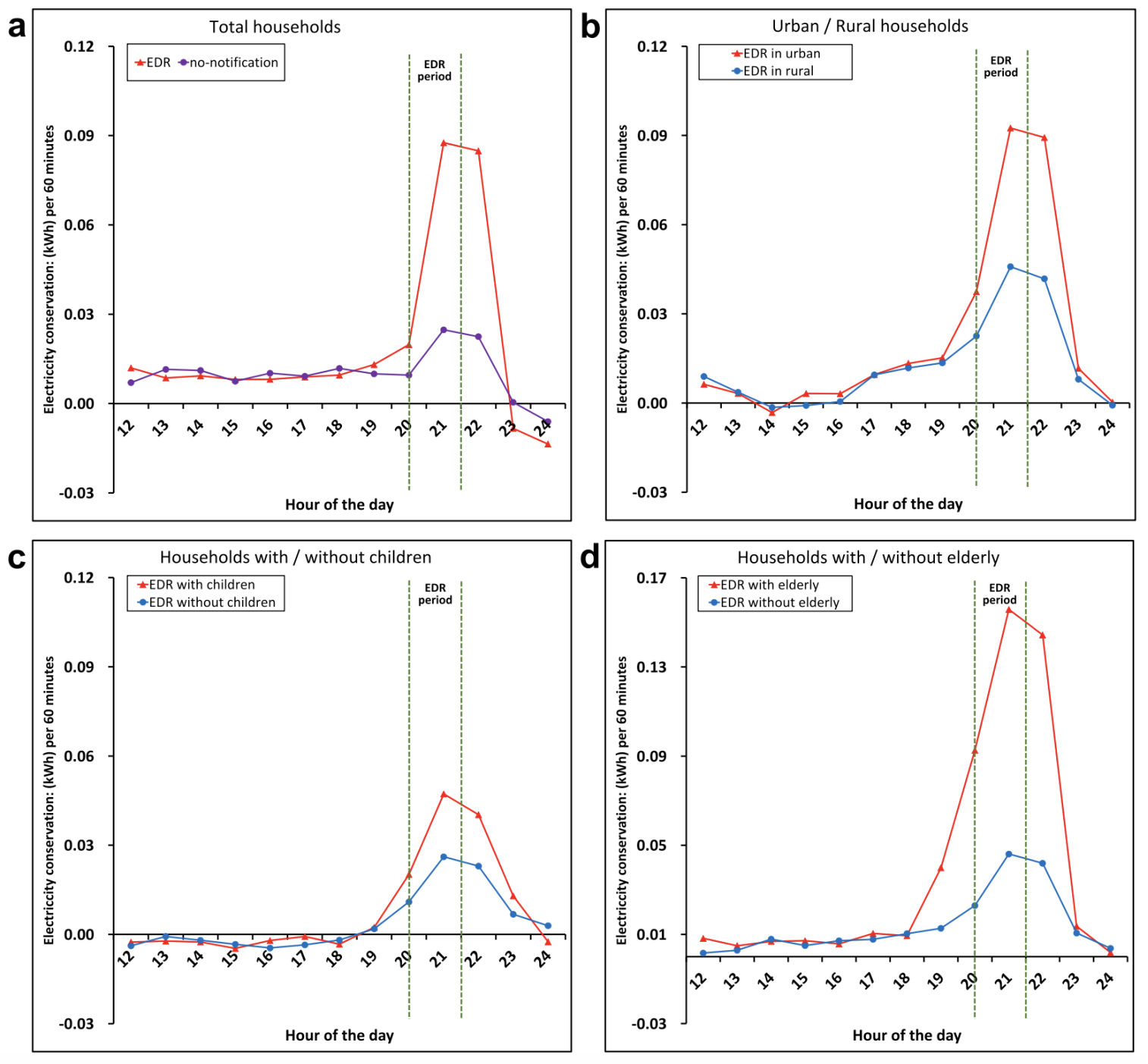 图1:基于激励的EDR措施对异质群体高峰时期用电的影响。(a-d. 描述了不同群体中EDR组和无通知组的电力节约量。纵坐标表示基准日和处理日之间的用电量(以千瓦时为单位)的差异。a.整体效果; b.城市和农村家庭;c.有儿童的家庭;d.有老人家庭)