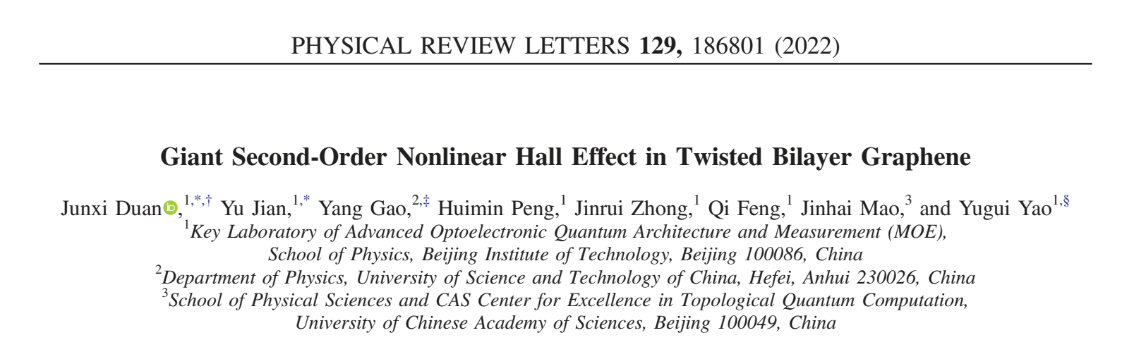 Junxi Duan*,†, Yu Jian†, Yang Gao*, Huimin Peng, Jinrui Zhong, Qi Feng, Jinhai Mao, and Yugui Yao*,“Giant Second-Order Nonlinear Hall Effect in Twisted Bilayer Graphene”,Phys. Rev. Lett. 129, 186801 (2022)  (†为共同一作,*为通讯作者)