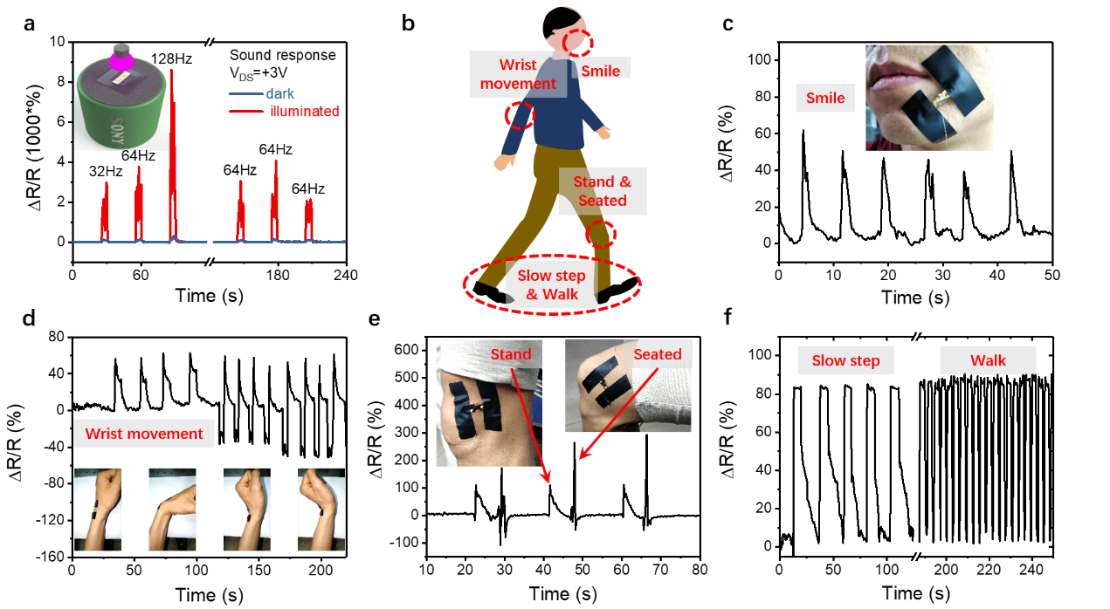 近年来,软体机器人、远程监控、人工智能和可穿戴医疗设备发展迅速,对应变传感器的柔韧性、灵敏度和低功耗有了更高的要求。目前,商用应变传感器主要基于金属材料。但是金属没有能隙,因此金属应变传感器的应变灵敏度因子一般会局限在1-5的小范围内。传统半导体的能隙应变虽然可调,但是传统半导体材料通常很脆,也限制了其在穿戴式设备的应变探测范围。相比于金属材料和传统半导体材料,范德华层状半导体材料具有优良的柔韧性、光电特性和压电特性,在能源储存、光电、传感、可穿戴设备等方面有巨大的应用前景。基于此,本跨国际与跨领域的合作团队提出了基于范德华层状半导体材料的柔性应变传感器。通过压电效应和光电效应的共同作用调节载流子的浓度和迁移率,首次实现了应变灵敏度因子可在高达23-3933区间内连续可调。此外,如下图所展示,该范德华柔性传感器可以检测声音引起的微小振动和监测人体日常运动,充分展示了其在机器人、远程监控、人工智能和可穿戴医疗等领域潜在的应用前景。
