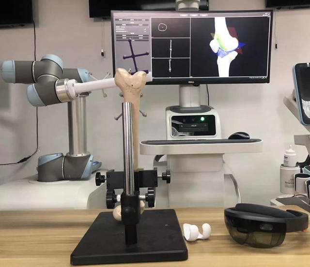 针对髋膝关节精准置换的临床需求,经过多年技术沉淀,团队突破了多项核心关键技术,研制了拥有自主知识产权的精准手术导航机器人技术。包括增强现实虚实融合、光学-惯性混合跟踪、点面全局快速注册、三维分层渲染和三维重建等技术。团队的核心产品之一 “牵星医航”智能骨科手术导航机器人,能辅助医生完成术中精准截骨和关节假体置换。此外,团队还研发了配套的骨科诊查软件系统,可实现前术后骨科医学影像的智能分析,辅助医生快速准确选择诊疗方案。目前,关节置换导航机器人和骨科诊查软件已完成研发并进入临床注册认证过程。