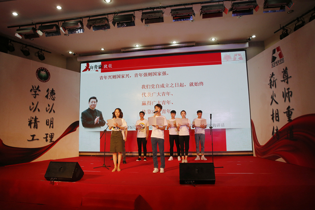 在北理工团员代表刘楠彬和北影团员代表王俊凯领诵下,全场青年团员共同朗诵了“习近平总书记寄语青春语录”,表达了两校青年学子不忘总书记嘱托,争做担当民族复兴大任的时代新人的心声。