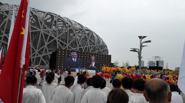 北京时间7月31日14点30分,来自北京理工大学的志愿者们与首都各岗位志愿者共计200人在惠新西街南口集合,坐上开往国家体育场的大巴车。满车的志愿者,阳光,兴奋,满腔作为申冬奥庆祝活动一份子的自豪。志愿者到达现场后迅速投入到旗手的工作当中,挥动手中的旗帜,或鲜艳的国旗,或圣洁的申奥旗。与志愿者一起参与活动的,还有龙狮表演队、腰鼓队、空竹队、太极扇队等,场面非常宏大。