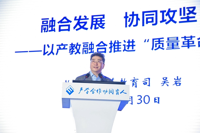 吴岩的主旨报告以“融合发展 协同攻坚——以产教融合推进‘质量革命’”为题。他强调,党的十九届四中全会为新时代高等教育事业发展指明了前进方向,要将推进高等教育治理体系和治理能力现代化建设的重大使命转化为高等教育强国建设的强大动力,二者之间的实践逻辑环环相扣,目标指向一以贯之,重大举措接续递进。吴岩强调,提高高等教育的管理质量和管理水平是推进高等教育治理体系和治理能力现代化建设的关键和重点,全面打赢“质量革命”攻坚战,就要打好“结构优化”攻坚战、“模式创新”攻坚战、“学习技术”攻坚战、“质量体系”攻坚战。吴岩强调,产教融合是促进校企协同育人的基本手段,是实现产学研用结合的主要方法,是提高人才培养质量的重要途径。深化产教融合,推进协同育人,必须从调结构、促升级,创机制、破壁垒等方面寻求突破,真正提高高等教育质量,助力新工科、新医科、新农科、新文科交织交融、引领发展。