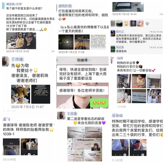 编辑:秦月 审核:金海波 阅读次数:“负责老师全程视频,两位同学将行李分类进行了细致的打包。收到的行李分类放的整整齐齐,每个打包箱子上都贴上了来自化院的毕业祝福。感动于老师和同学们的耐心细致周到,在最特别的毕业季里感受到了来自化院老师们最暖心的祝福和关怀。感谢最近忙碌的所有老师和同学,真的辛苦了!”这是化学与化工学院2017级硕士毕业生王思童发给禄甜导员的信息,更是未返校的化院毕业生们的心声。